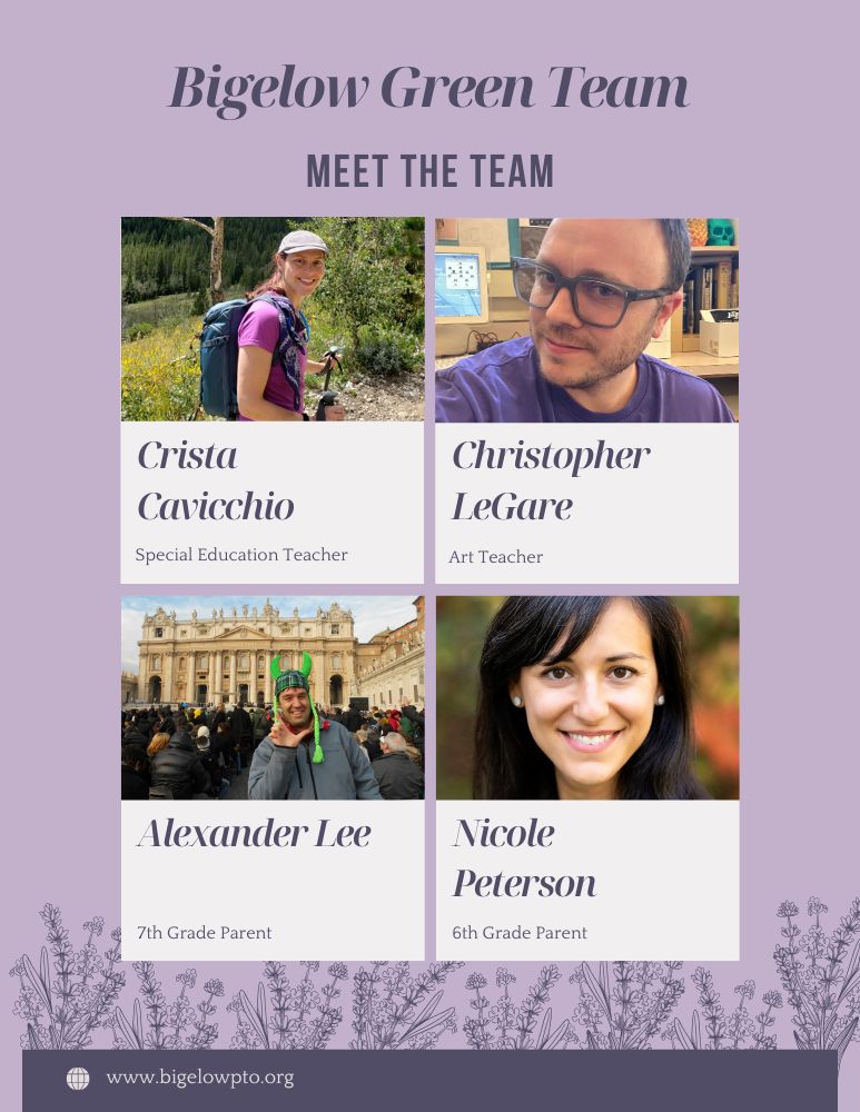 There are now Green Captains at all Newton Public Schools. At Bigelow, Crista Cavicchio (special education teacher) and Christopher LeGare (art teacher) are the educators who have stepped up. In addition, Alexander Lee (7th grade parent) and Nicole Peterson (6th grade parent) are looking to identify other parents who want to help Bigelow become more sustainable.