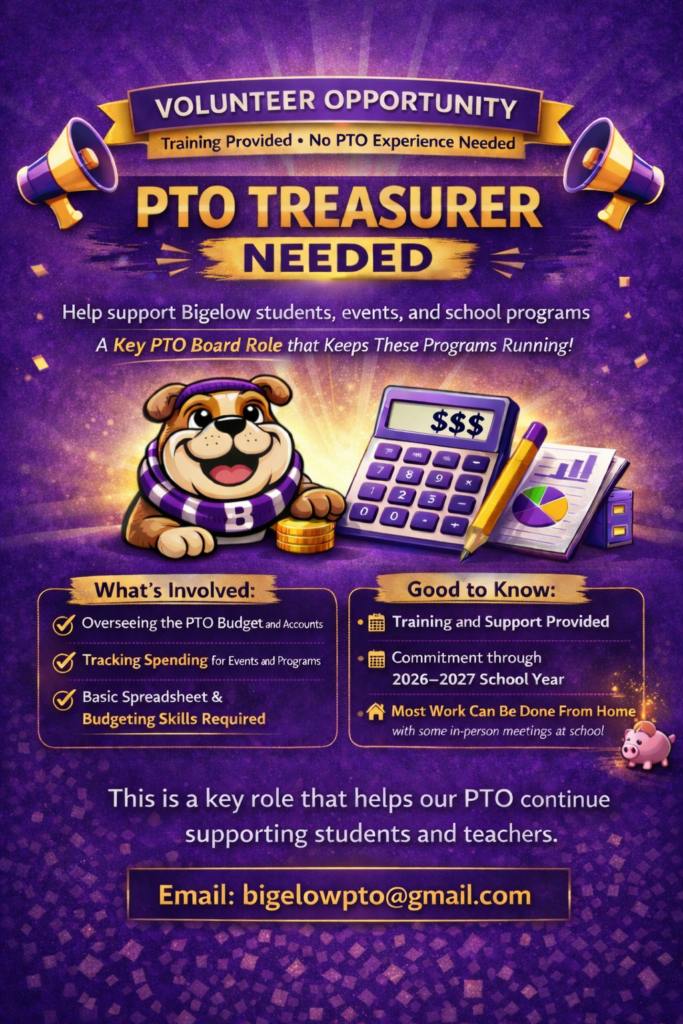 Due to unforeseen circumstances, our Bigelow PTO needs a volunteer Treasurer as soon as possible.