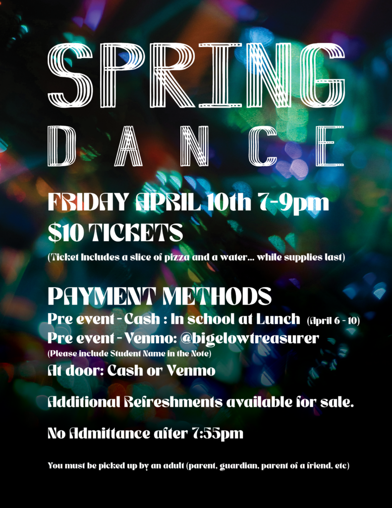 School Dances: Our PTO sponsors upfront costs of all Bigelow school dances, which are only partly offset by ticket sales.