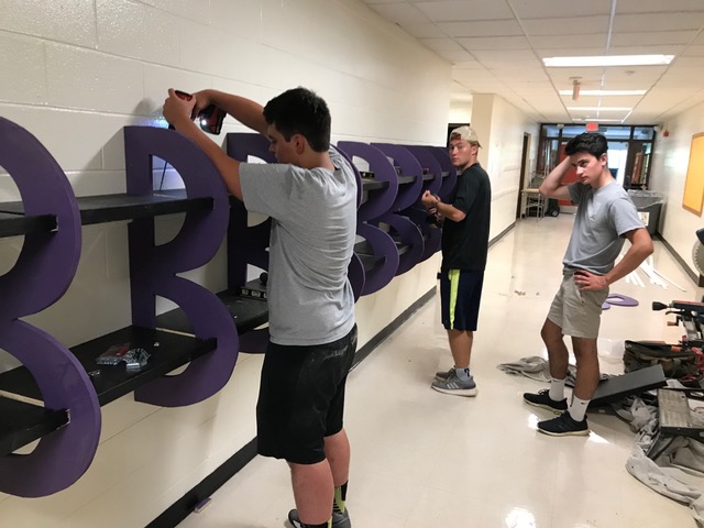 In addition to the wonderful work completed by our custodial crew over the summer, some former students and their parents helped construct new shelving outside the cafeteria on the Friday before Labor Day. The project was led by Grayson Hargens (Bigelow class of ’16) as a capstone for his Eagle Scout rank from the Boy Scouts. Also lending a hand was his brother, Holland, their parents Andrew and Melissa, and classmate James Flaumenhaft. This shelving, which replaces the backpack hooks previously located along the wall, will enable students to safely store their binders and books during lunch. A big thanks to Grayson and his crew. Check out the creative use of school colors and letter B!
