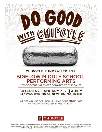 This Saturday, Jan 31 from 4–8pm at the Newtonville Chipotle, get your family’s burrito fix and support Performing Arts at Bigelow at the same time!