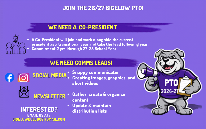 This is a great opportunity to get involved, stay connected with our Bigelow community, get to know teachers, staff and families from other schools! Parents and guardians from all grades may join! We especially welcome incoming 6th grades to participate and learn more about middle school.
